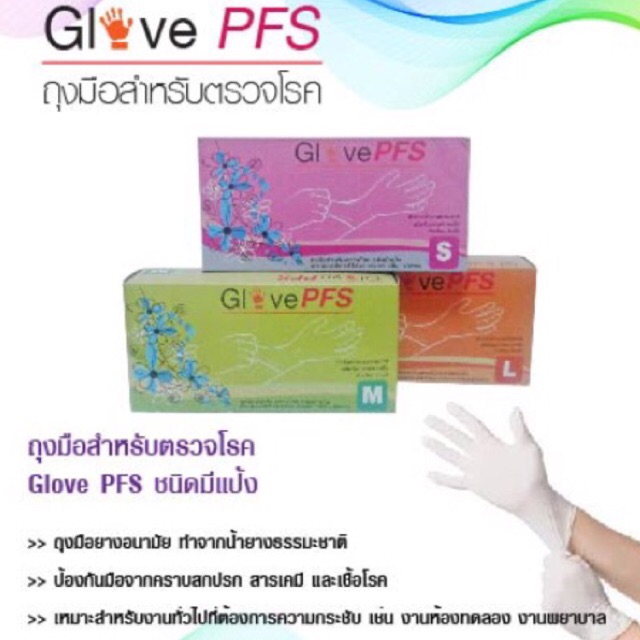 ขาย ถูกสุด ถุงมือแพทย์ ถุงมือตรวจโรค ถุงมืออนามัย ถุงมือยาง Glove PFS ชนิดมีแป้ง ผิวเรียบ XS ,S, M, L ราคาถูกส่งฟรีทั่วประเทศ